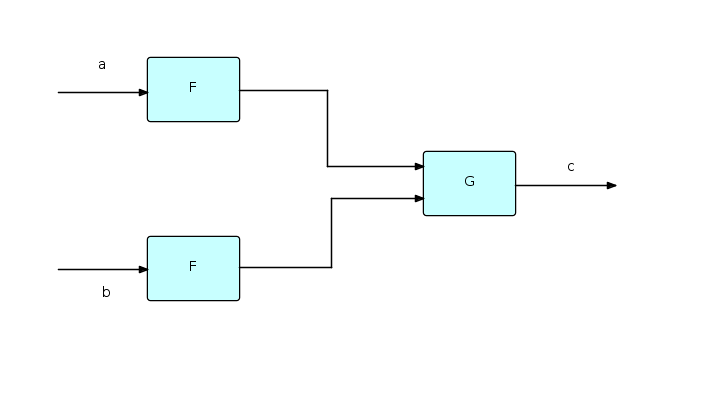 Just as in functional notation F can be used twice because it only works with values, and therefore has no side effects, in FBP two instances of a given component may be running concurrently with each other, and therefore FBP components must not have side-effects either. Functional notation could clearly be used to represent at least a part of an FBP network.